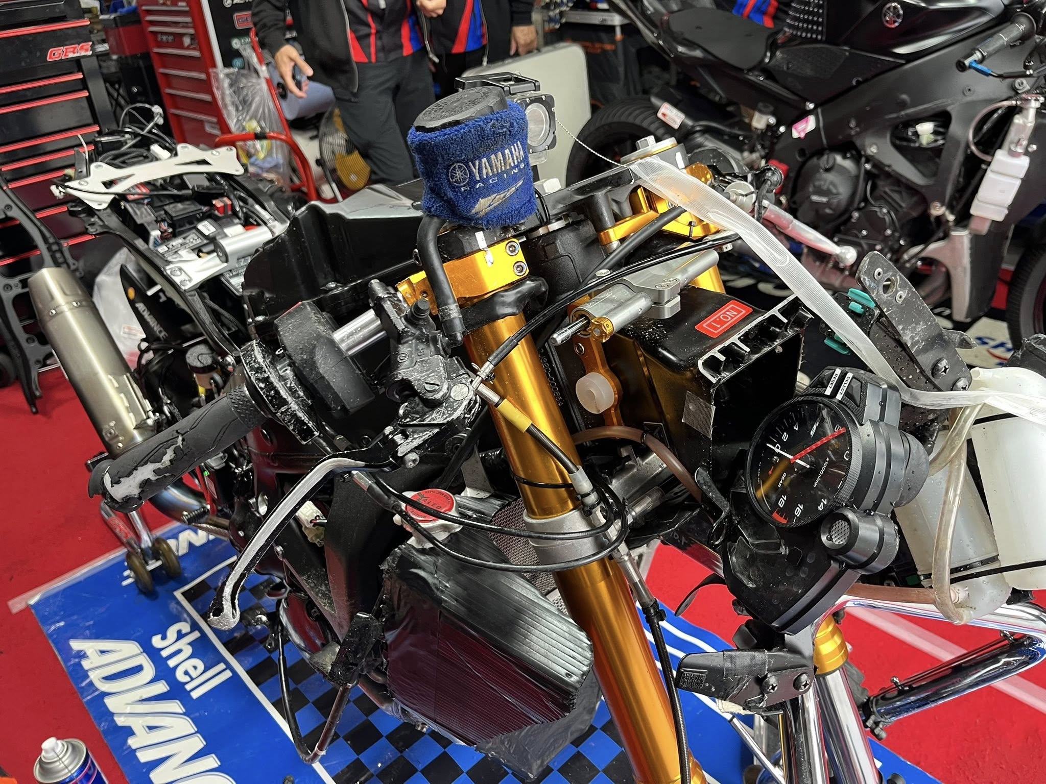 特に予選日、雨の路面コンディションの中、チームをアクシデントが襲います。セッション開始早々、ライダーはアドウッドコーナーでまさかの転倒。マシンは激しくコースバリアと接触し、エンジンまで割れるほどの大破を喫してしまいました。